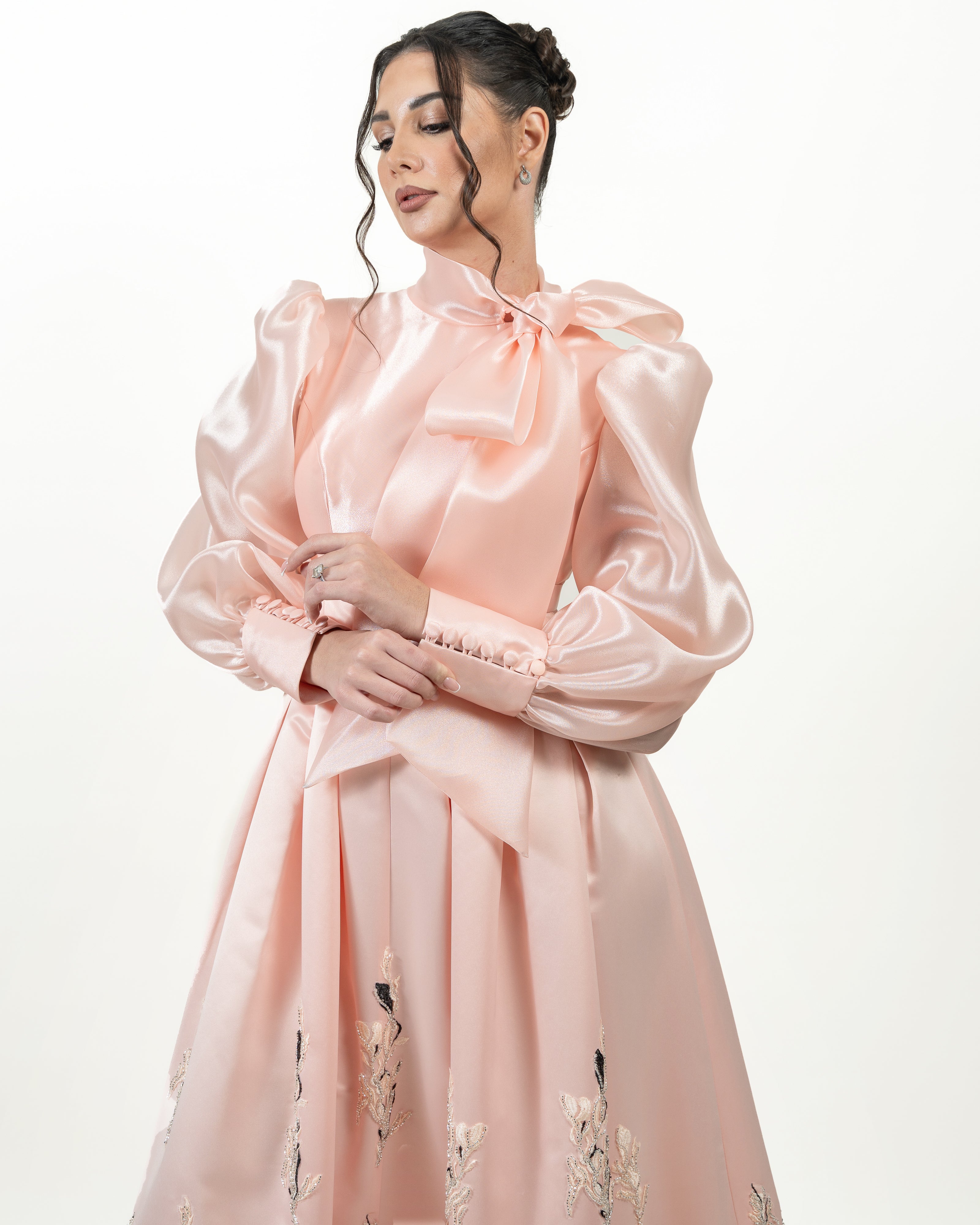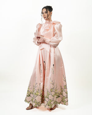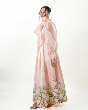 This enchanting gown blends vintage sophistication with modern grace. Crafted in a soft blush peach taffeta, it features voluminous Organza puff sleeves, a dramatic bow-tie neckline, and a cinched waist that flows into a full A-line skirt. The hem is adorned with delicate floral embroidery in shades of green and ivory, adding a romantic, garden-inspired touch. Perfect for formal events or red-carpet moments, the Blush Garden Elegance Gown exudes timeless femininity and refined charm.