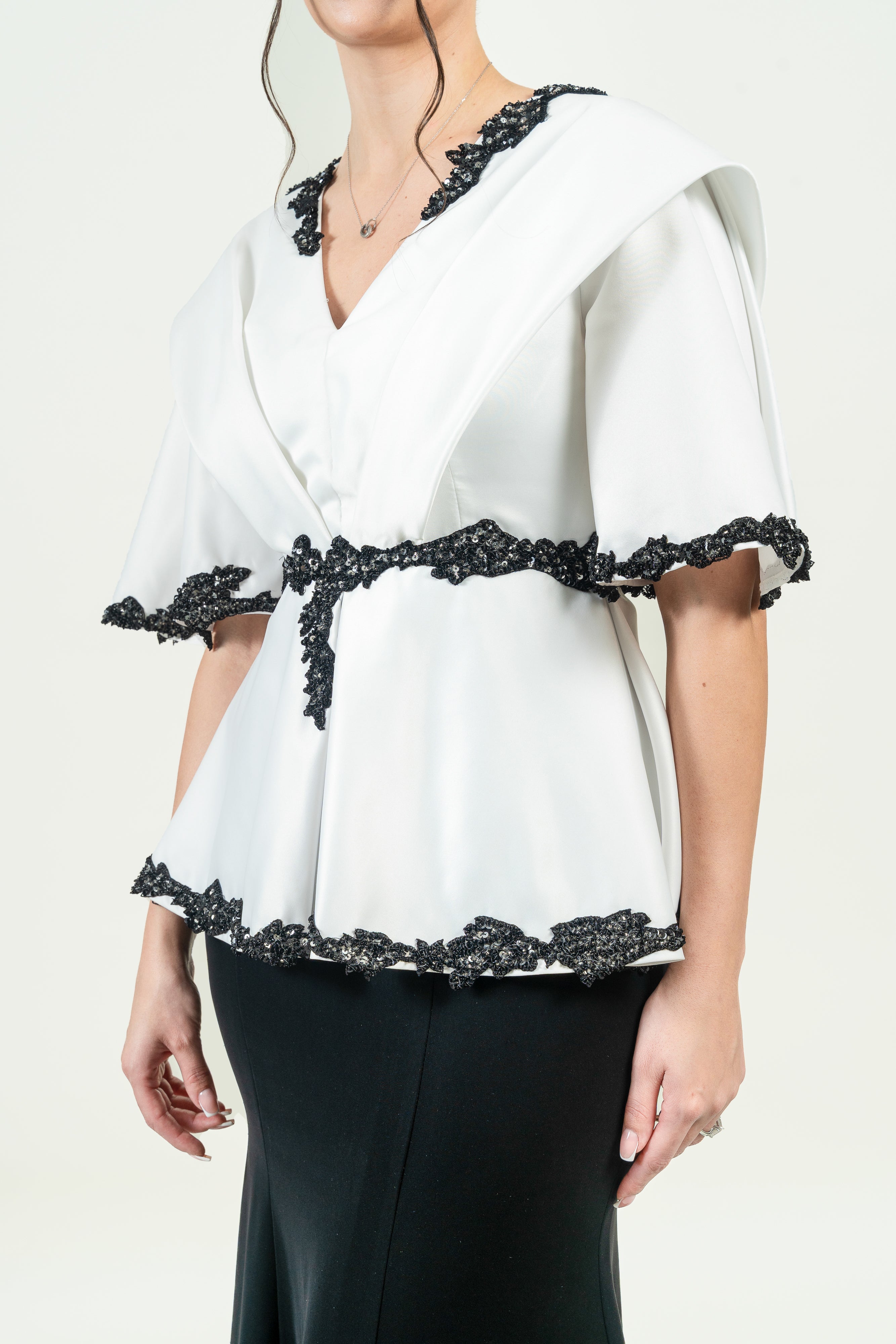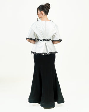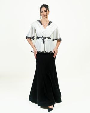This sophisticated two-tone evening ensemble features a flowing white top with a structured collar and flared sleeves, beautifully accented by delicate black lace trim along the neckline, cuffs, and waist. The fitted black mermaid skirt adds a graceful silhouette, balancing modern elegance with timeless charm. Perfect for formal events, or special occasions where understated glamour makes a lasting impression.