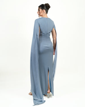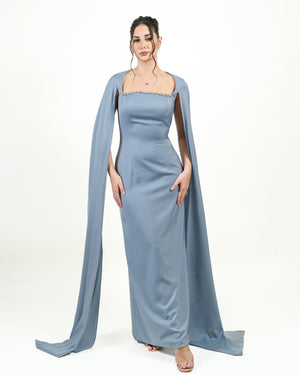 Step into timeless elegance with the Ethereal Grace Cape Gown. Crafted from a smooth, slate-gray satin fabric, this floor-length dress exudes sophistication with its minimalist silhouette and refined details. The square neckline is delicately accented with subtle embellishments, while the dramatic draped cape sleeves cascade gracefully to the floor, creating a regal, flowing effect with every movement. Perfect for galas, formal evenings, or red-carpet events, this gown captures modern glamour with a touch of classic allure.