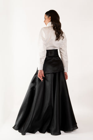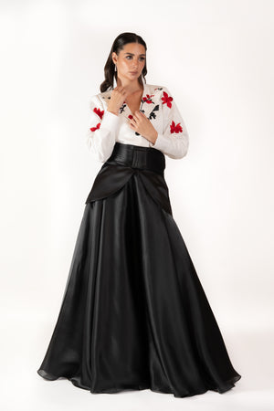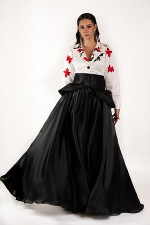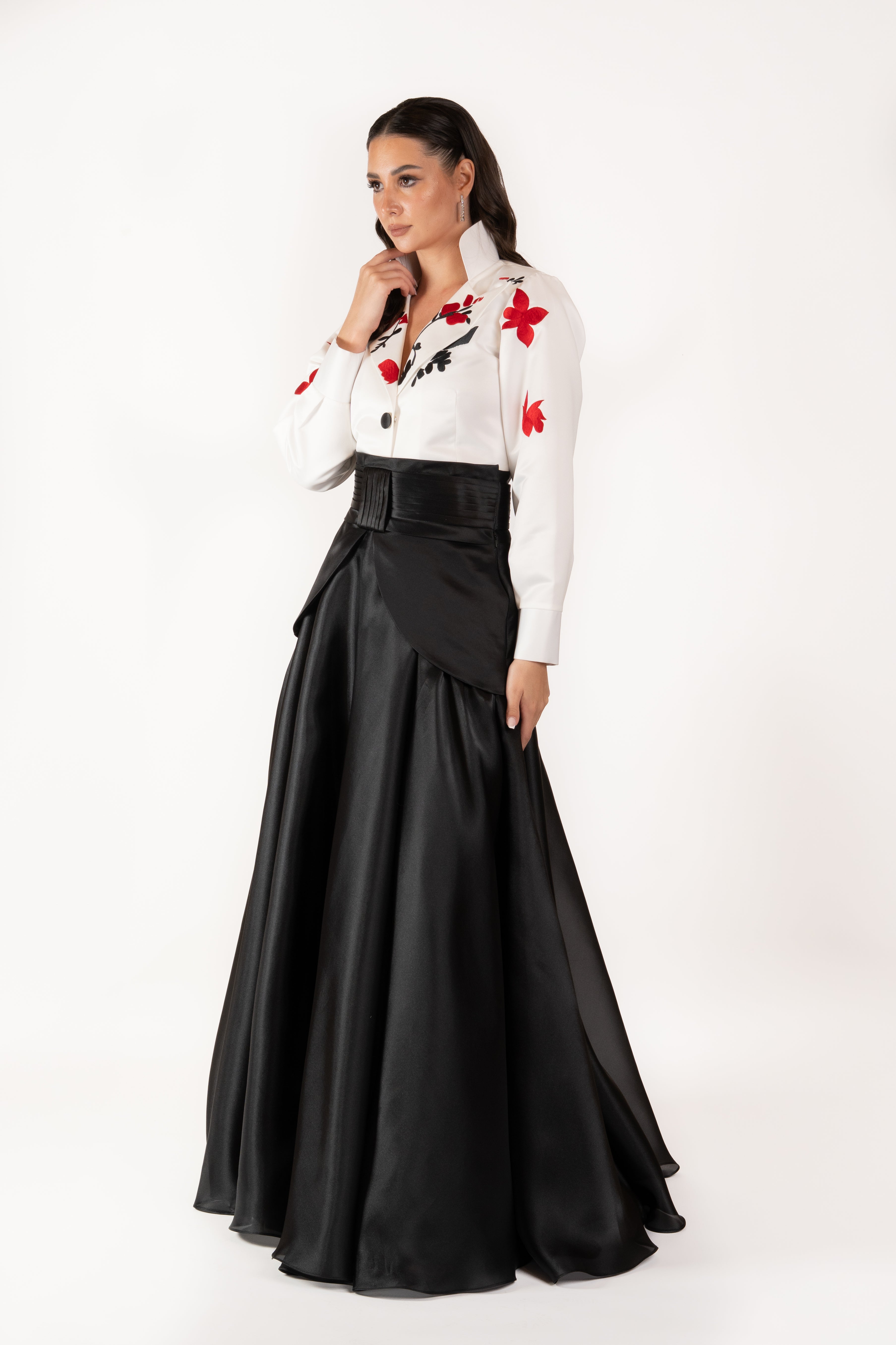 A chic fusion of elegance and charm, this two-piece set pairs a crisp white blouse with bold red floral embroidery and a flattering V-neckline with a high-waisted black maxi skirt that flows gracefully to the floor. Perfect for formal gatherings, cultural events, or evening occasions, this ensemble creates a sophisticated silhouette with timeless style and romantic flair.