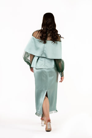 Exude modern sophistication in this pastel green midi dress, designed with a structured bodice and peplum waist for a flattering silhouette. The dramatic sheer net yoke and voluminous sleeves with cuff details add a high-fashion edge, while the pleated hemline offers a delicate finishing touch. Perfect for formal gatherings, evening events, or fashion-forward occasions where elegance meets contemporary style.