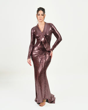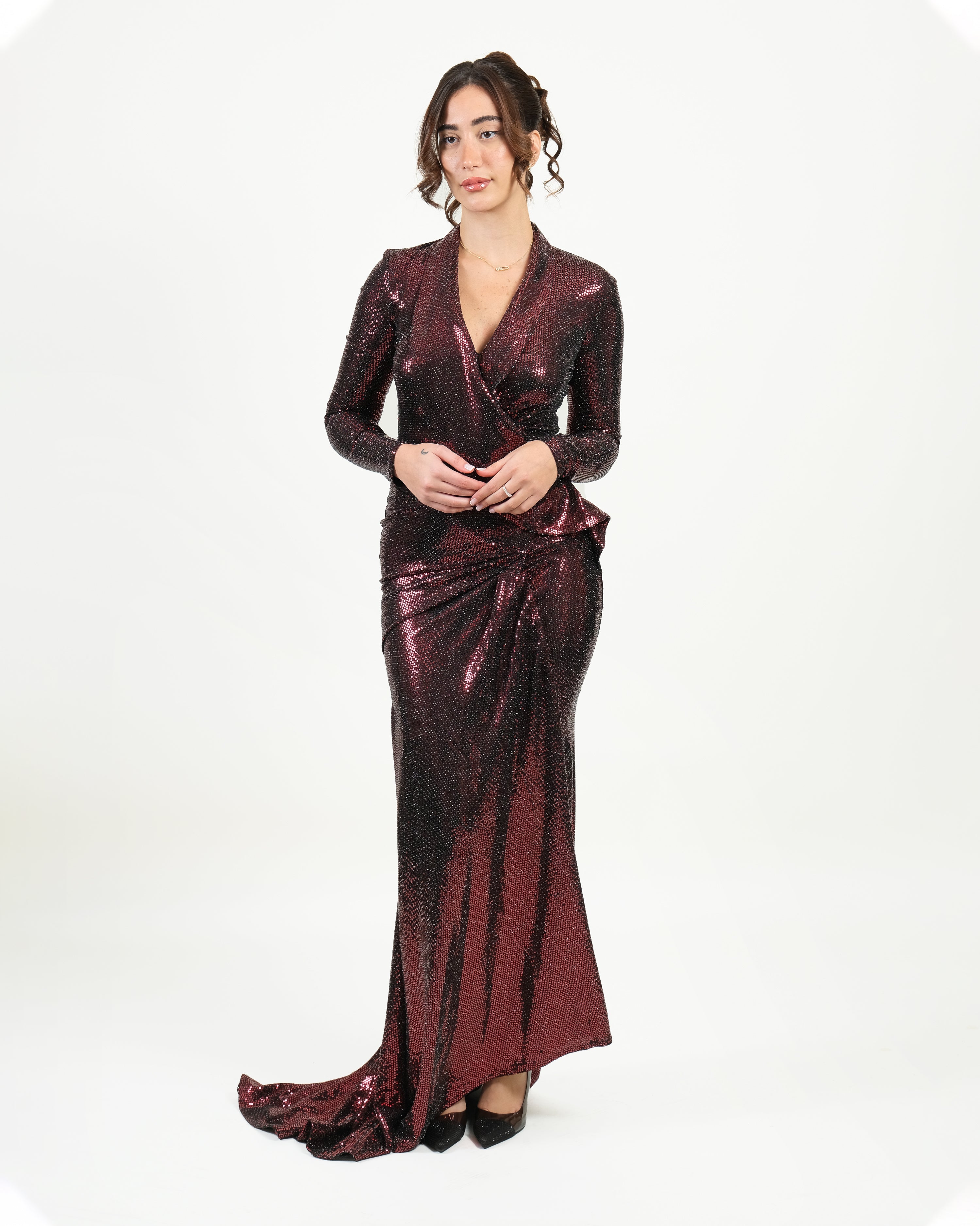 Turn heads in this striking sequin wrap gown, designed to make a bold and elegant statement. The figure-hugging silhouette features a deep V-neckline and long fitted sleeves, exuding sophistication and confidence. A draped peplum detail at the waist adds a touch of couture flair. Perfect for evening events, this gown captures the essence of modern luxury and timeless allure.