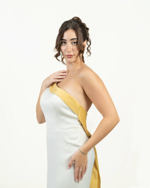 Radiate elegance in this stunning one-shoulder gown, featuring a sleek white silhouette accented with a bold golden-yellow trim and trailing back panel. The dress is beautifully adorned with hand-embellished floral motifs near the hem, adding a touch of artistic charm. Perfect for evening celebrations, this dress combines modern minimalism with graceful sophistication.