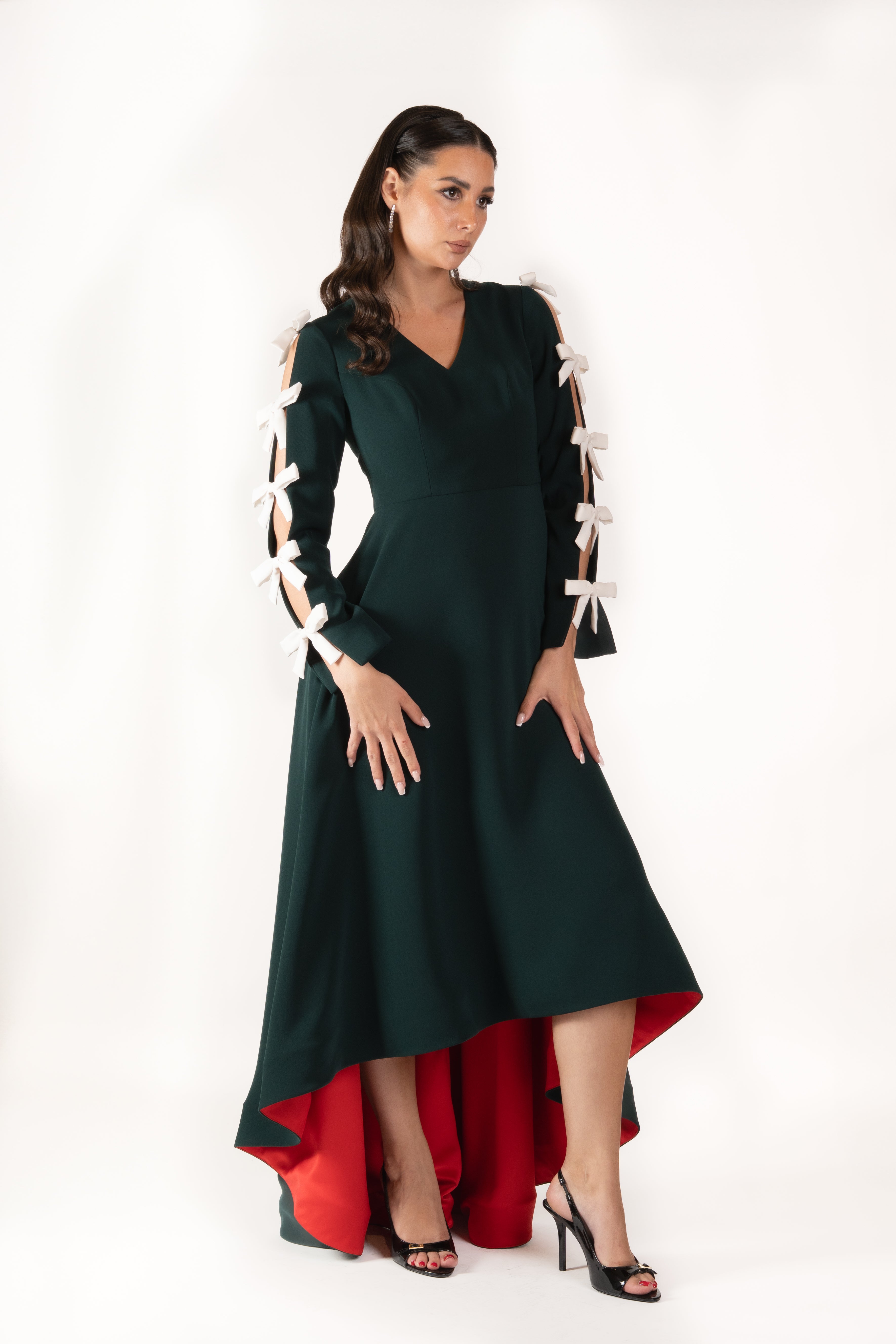 Make a bold style statement in this bottle-green asymmetrical-hem dress, blending playful details with refined design. The sleeves feature open cutouts tied with contrasting white bows, adding a modern, feminine twist. A dramatic red lining peeks through the angled hemline, creating striking movement with every step. Perfect for cocktail parties, evening gatherings, or fashion-forward events, this dress balances sophistication with contemporary charm