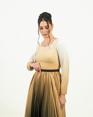 Chic and contemporary, this elegant maxi dress features a fitted white bodice with long sleeves and a flattering scoop neckline. The standout detail is the flowing pleated skirt that transitions beautifully from white to rich mocha in a soft ombre gradient. Perfect for daytime celebrations, evening gatherings, or formal occasions, this dress combines modern simplicity with timeless sophistication.