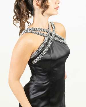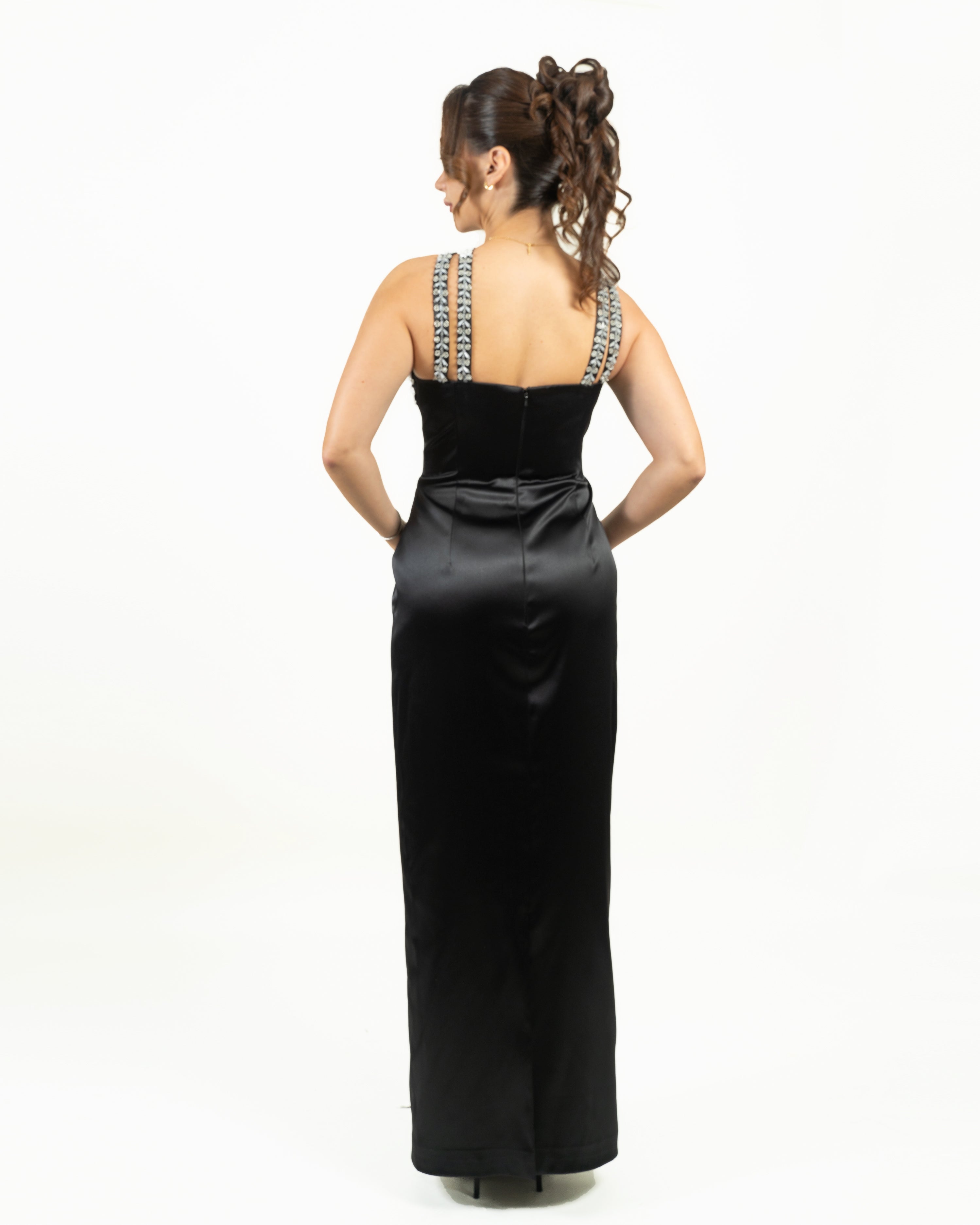 Step into timeless sophistication with the Midnight Elegance Crystal-Trim Satin Gown. This floor-length black dress features a sleek, figure-skimming silhouette crafted from luxurious satin that glides effortlessly with every movement. The halter neckline is accentuated by dazzling crystal embellishments arranged in a chic crossover design, adding a touch of glamour and refinement. Perfect for formal evenings, galas, or red-carpet events, this gown combines modern allure with classic grace.