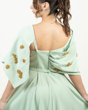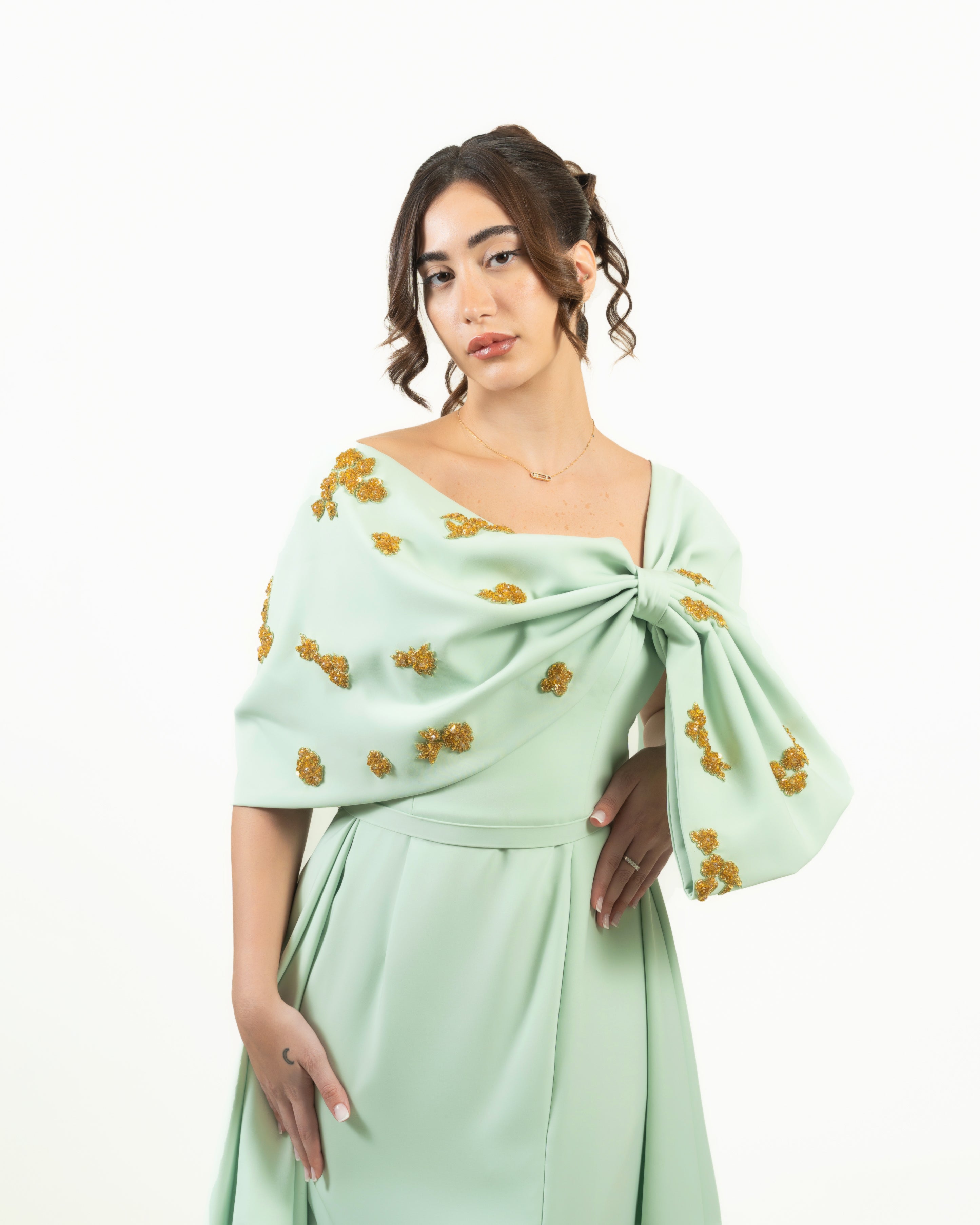 Graceful and unique, this mint green gown features an elegant off-shoulder neckline adorned with a dramatic oversized bow. The bow is delicately detailed with golden floral embellishments, adding a touch of luxury and charm. A sleek fitted waist and soft front slit enhance the flowing silhouette, creating a perfect balance of sophistication and modern flair. Ideal for weddings, galas, or any event where you want to stand out with refined elegance.