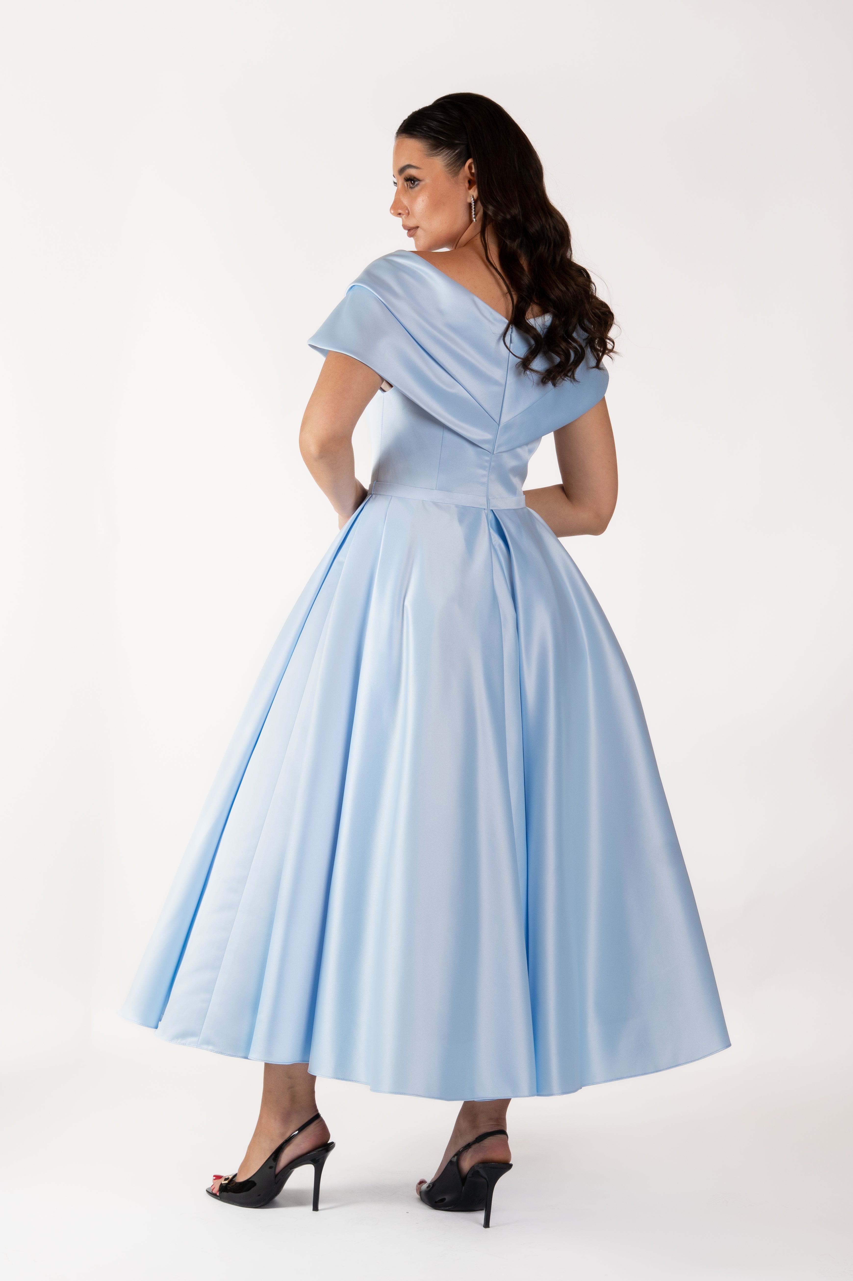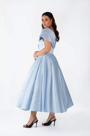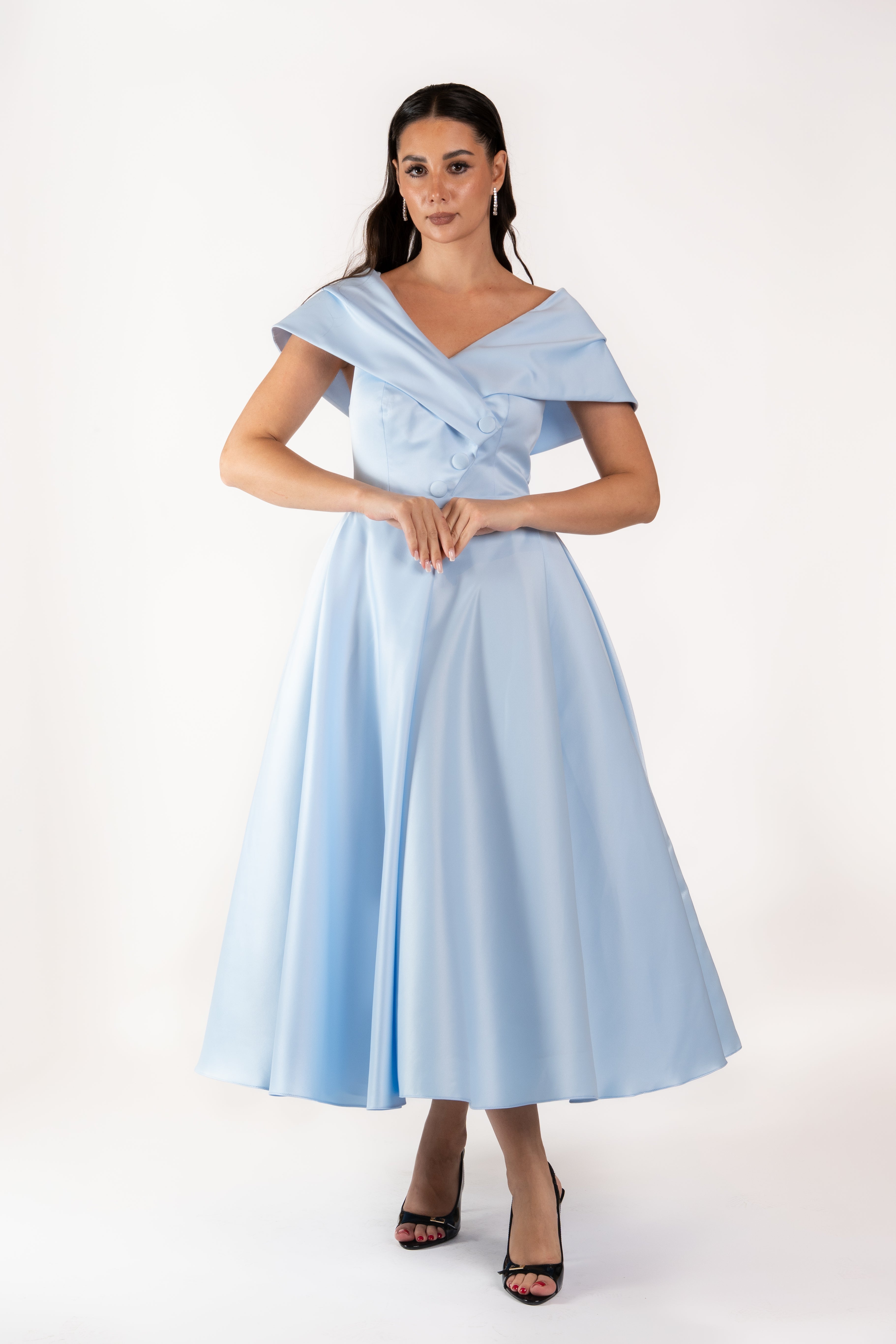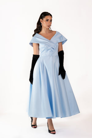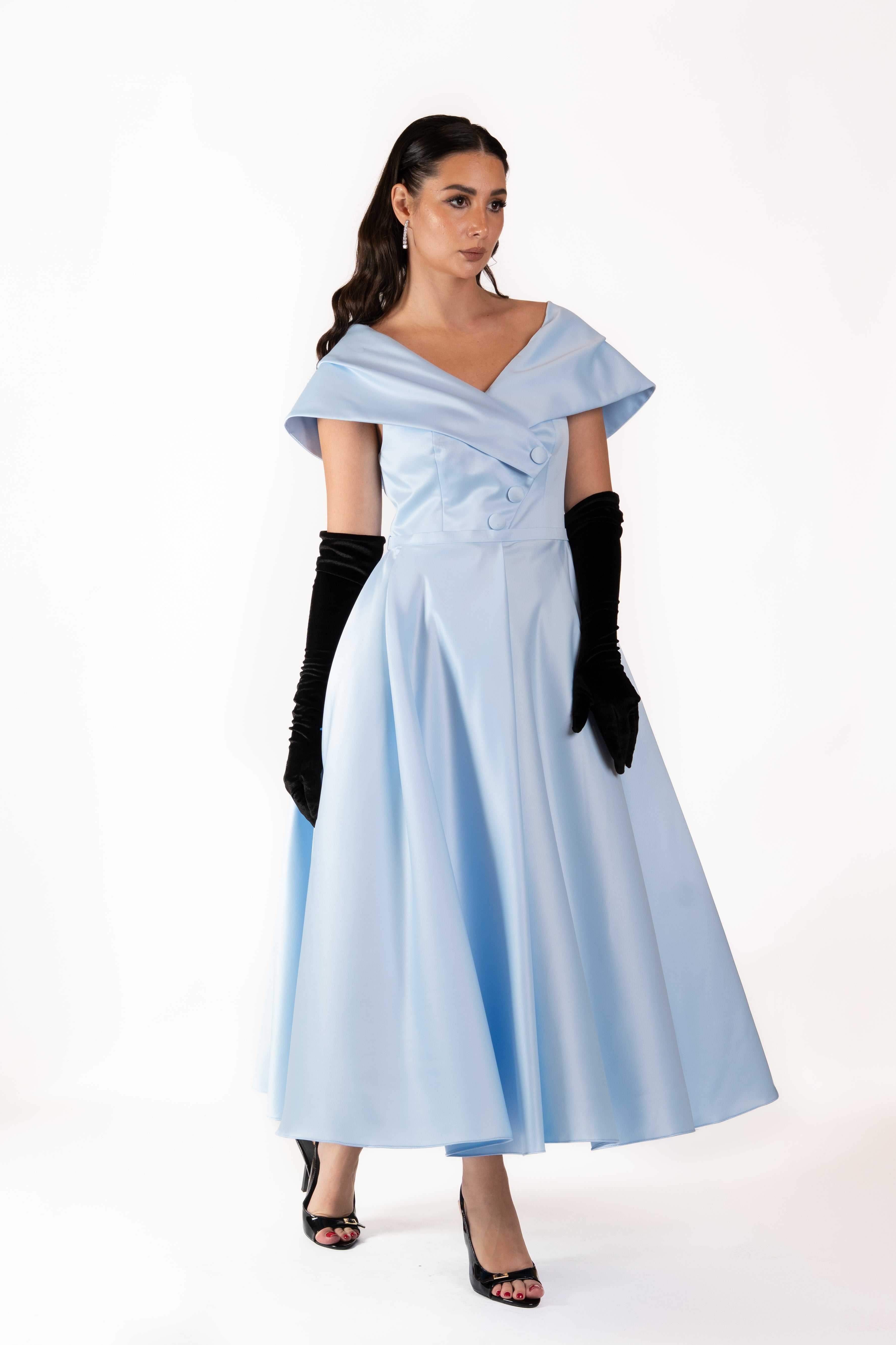 Step into timeless elegance with this midi dress, designed with a graceful V-neckline and a flattering fit-and-flare. The structured bodice and button detailing a touch of vintage, while the flowing skirt creates effortless movement. Styled here with black opera gloves, this dress is perfect for formal evenings, cocktail parties, or any occasion where classic charm meets modern grace.