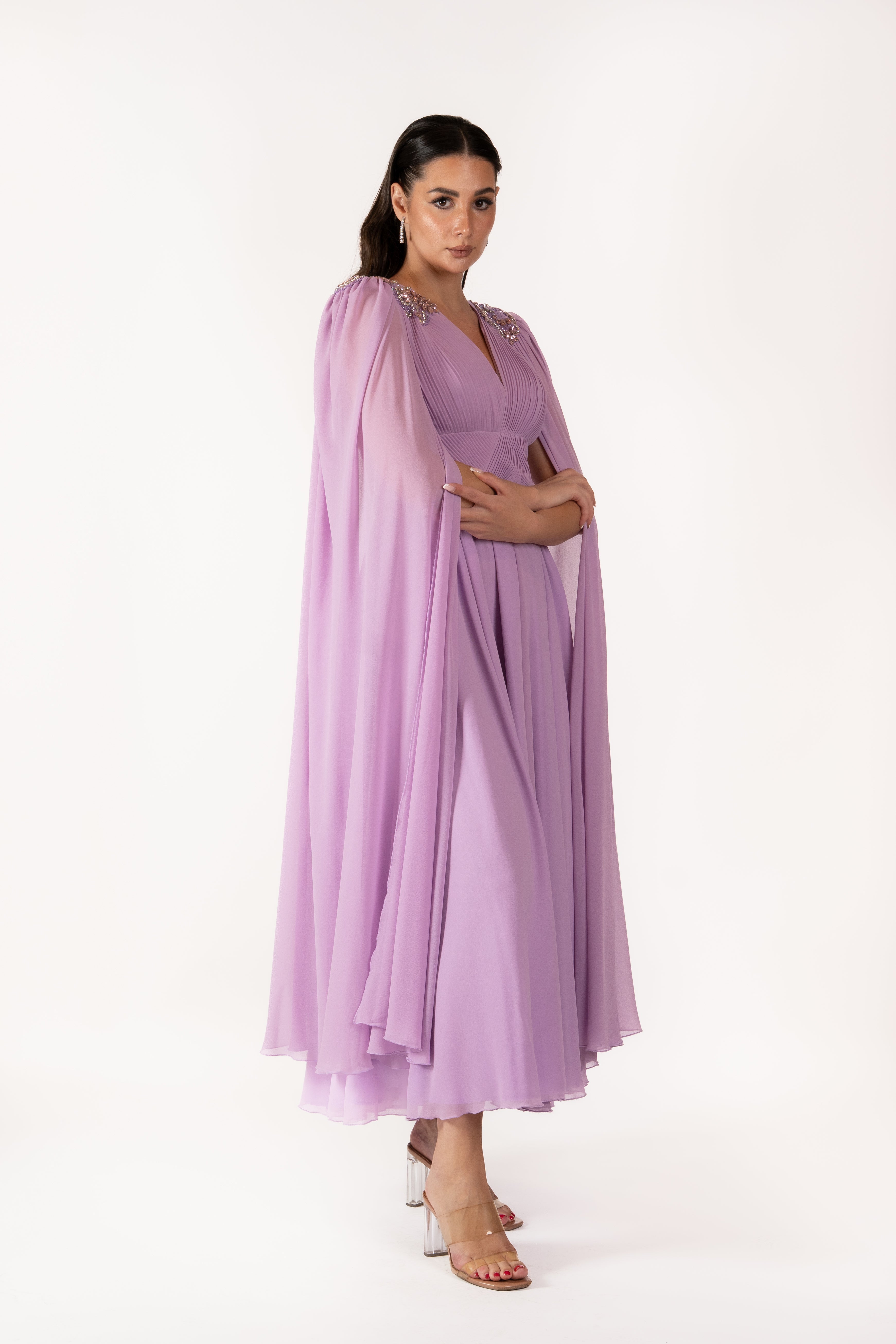 Step into elegance with this enchanting gown, designed to make a lasting impression. Featuring a deep V-neckline, designed with delicately embellished shoulders, flowing sheer cape sleeves. The standout feature is the elegant open-back design, adding allure to the otherwise regal silhouette. Perfect for evening events, weddings, or special celebrations.