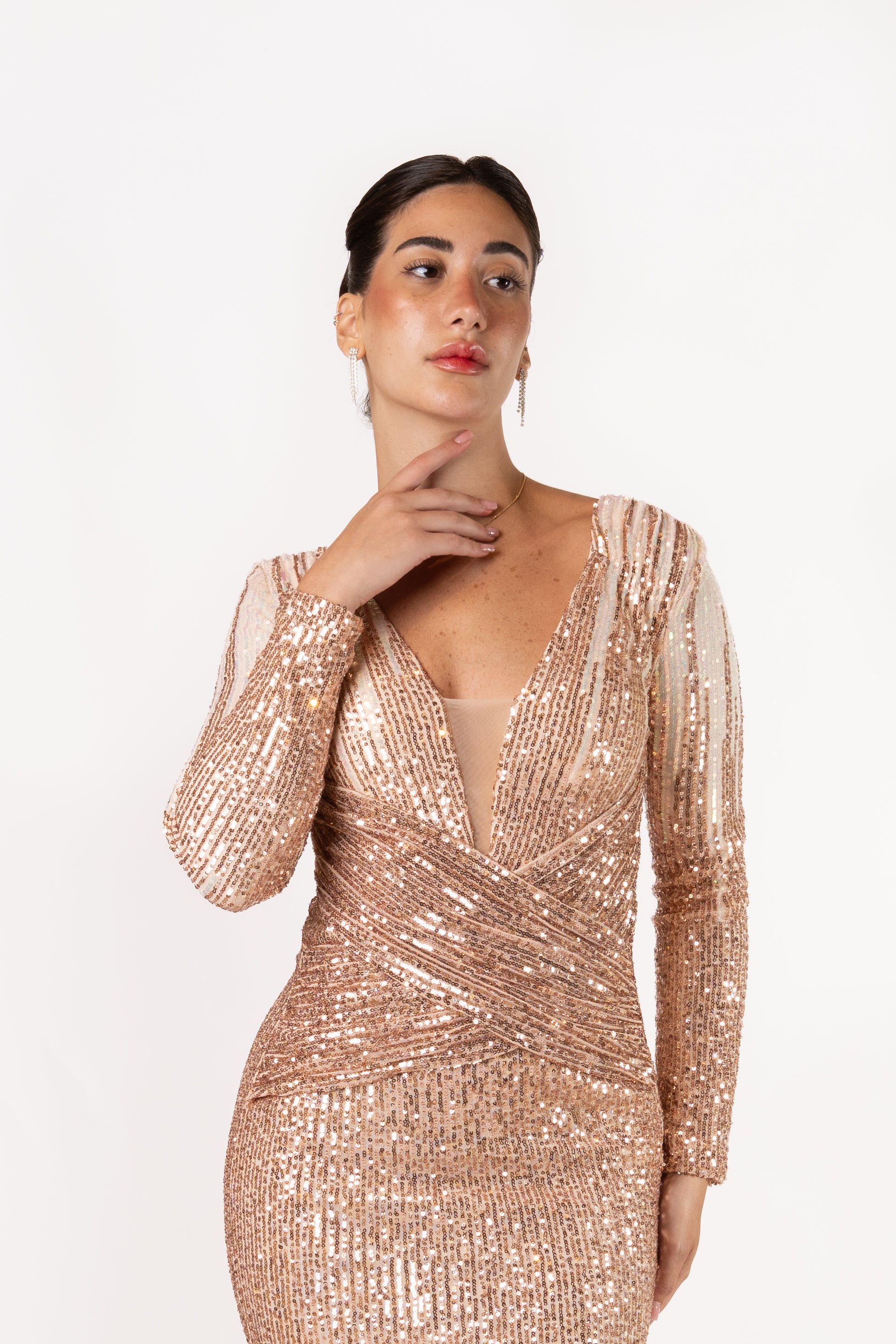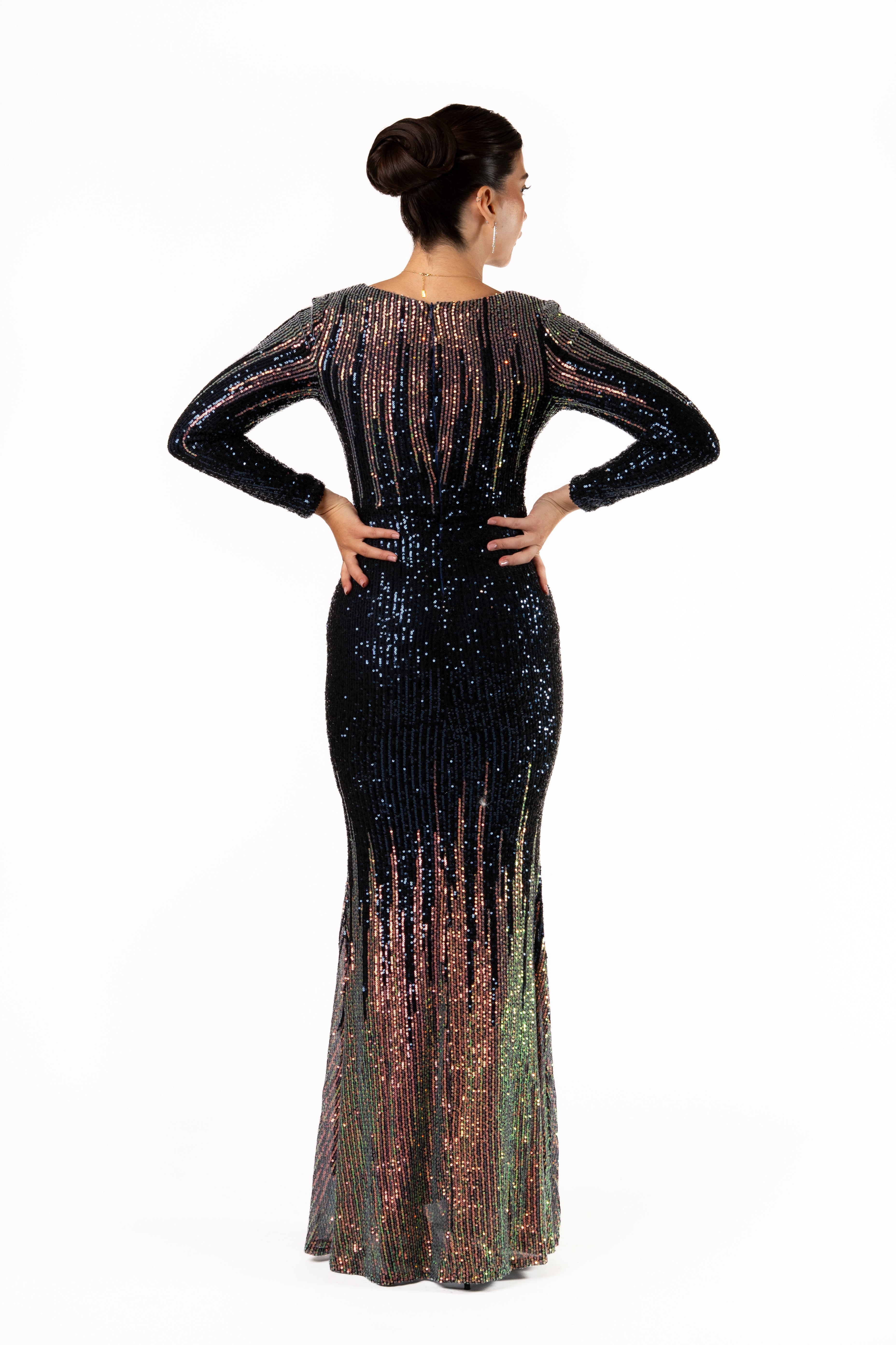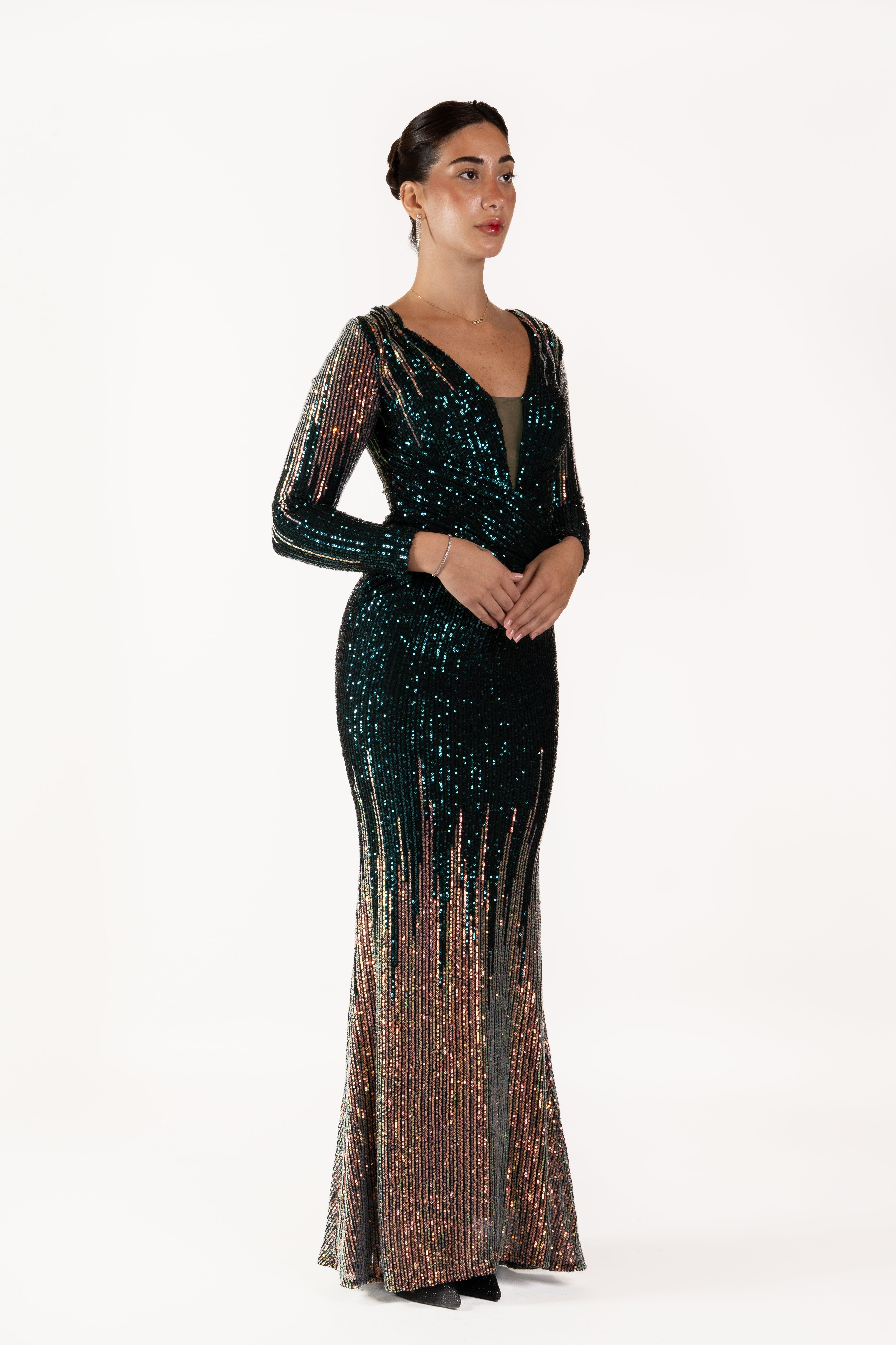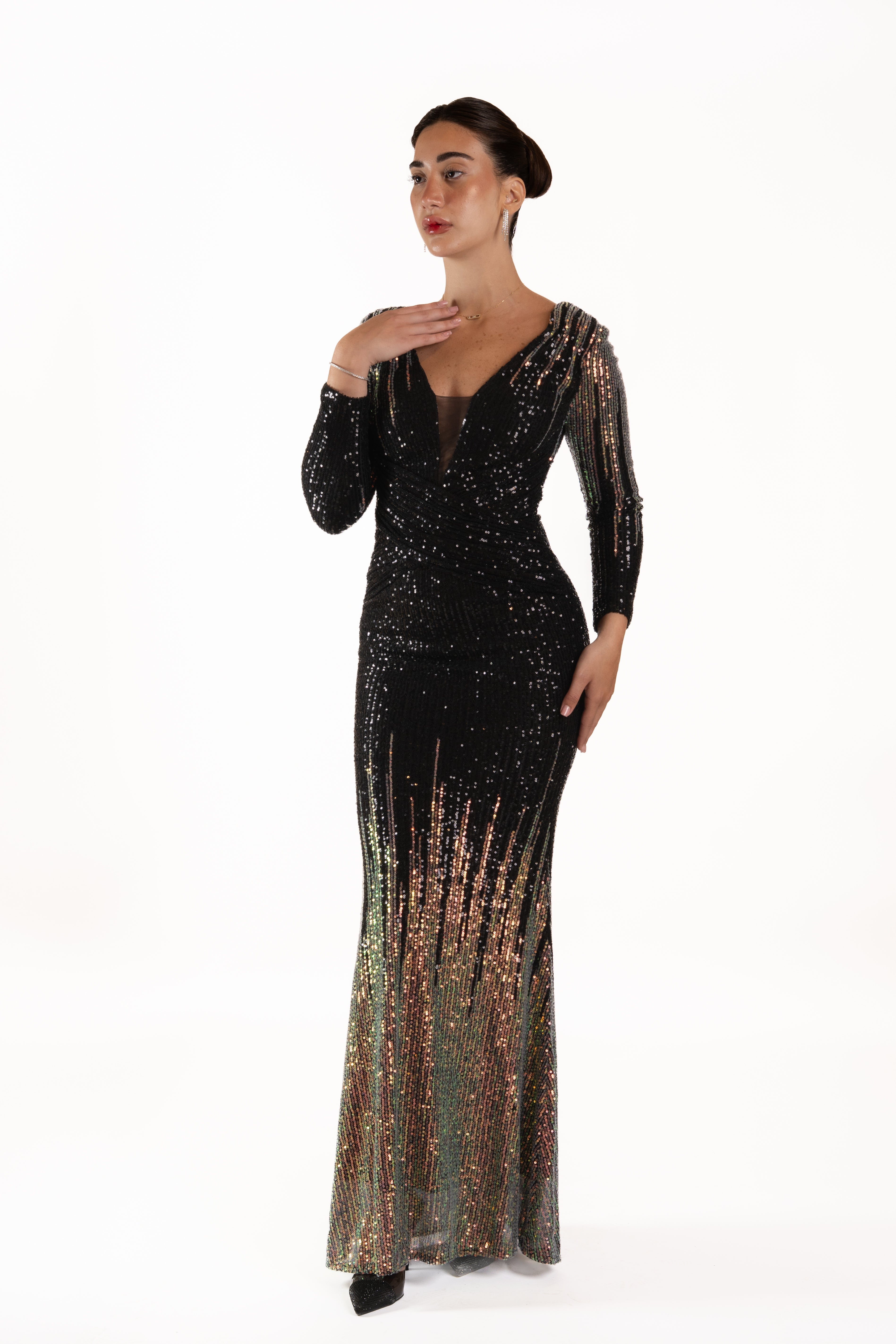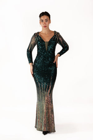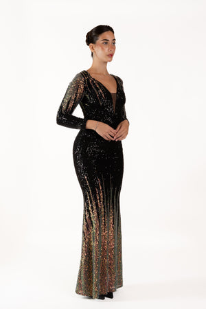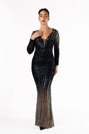 Turn heads in this stunning full-length evening gown, designed to dazzle with every step. The deep V-neckline long fitted sleeves, and curve-enhancing silhouette are brought to life with shimmering sequins that catch the light from every angle. Finished with a dramatic floor-sweeping hem, this gown is perfect for galas, formal events, red-carpet moments, and special celebrations.
